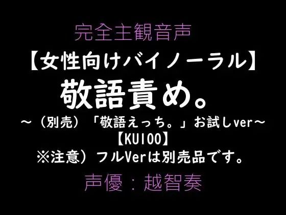 ※こちらの作品は、お試しVerとなっております。 【女性向けバイノーラル】敬語えっち。〜丁寧な隠語、耳元距離0.01mm〜から、ストーリートラックを1つ抜粋したものとなります。 誤って購入をされないようにご注意ください。 なお、キャストトークのみ別音声となっております。 丁寧な言葉遣いで言葉責めされる快感には抗えない。 もうこれだけです。 今回ももち…